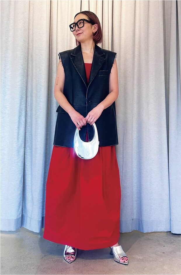 ジレ¥33,000、ドレス¥31,900、シューズ¥37,400(全てプランクプロジェクト)、バッグ¥77,000(コペルニ/全てプランクプロジェクト 青山店)