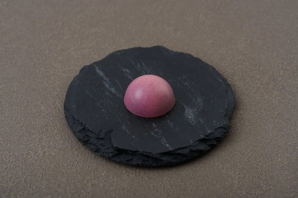 「紅(くれない)」は、ホワイトチョコレートガナッシュをベースに、あまおうのコンフィチュールを合わせた一粒。果実の甘酸っぱさと日本酒の香りが重なり合い、酸味と甘味のバランスを引き立てる。