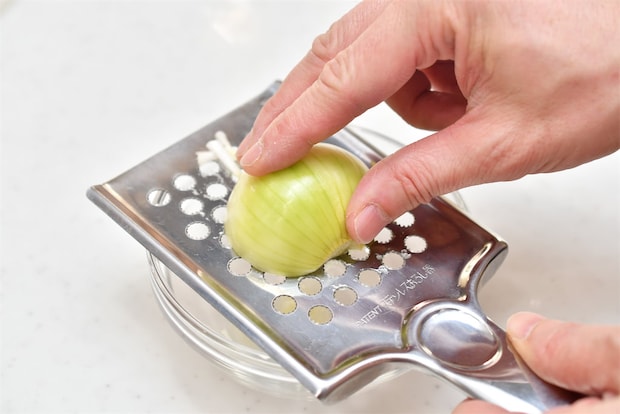 肉100〜200gあたり、玉ねぎ1/4〜1/3個分が目安。今回は、牛肉150gに対して、ミニサイズの玉ねぎ1個分をすりおろしました。