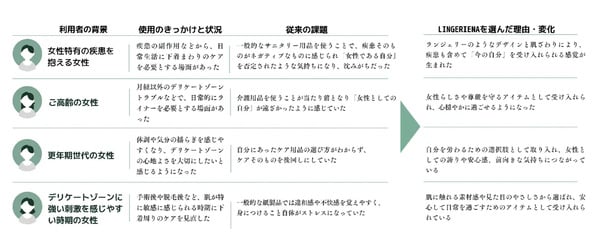 さらに近年では、生理に限らず、更年期や体調の変化、女性特有の疾患、介護など、ライフステージによって下着や身体まわりのケアを必要とする場面が多様化。それにも関わらず、サニタリーやインナーに対する価値観や製品のあり方は、長年大きく変わらないままだ。