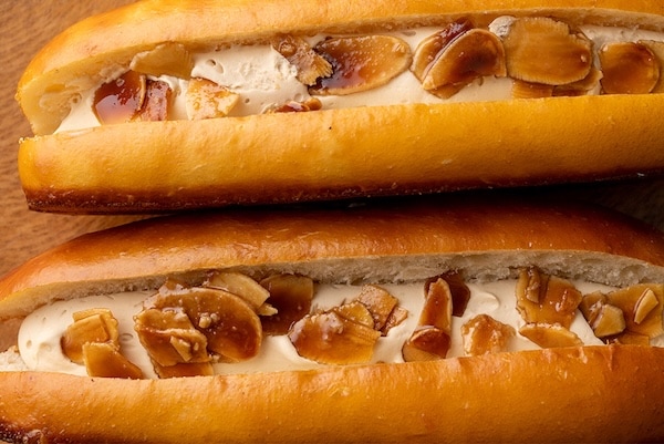 「Mehl」のブッターシュタンゲンは、ドイツで親しまれるブレッツェル生地を細長く成形しクリームを挟んだ焼き菓子だ。今回、「うまいもんドットコム」に新たに登場した沖縄黒糖のブッターシュタンゲンには、黒糖クリームを挟んでいる。生地にはほどよい塩味と香ばしさがあり、黒糖は一度キャラメル状に煮詰めて香りとコクを凝縮。さらに黒糖をまとわせたアーモンドスライスをトッピングすることで、食感と風味のアクセントを添えている。ひと口目から沖縄黒糖ならではのやさしい甘さが広がる、奥行きのある味わいだ。