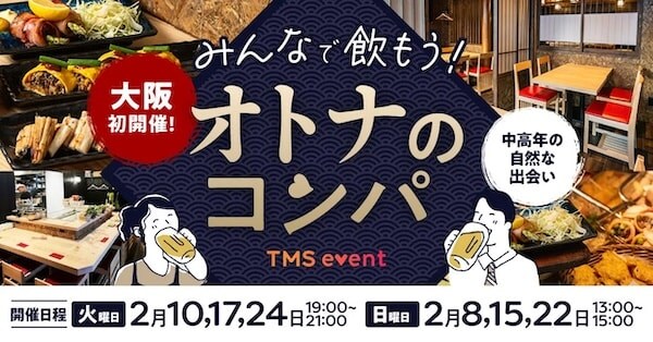 「TMSイベントポータル」は、2月より「みんなで飲もう!オトナのコンパ」を開催する。第1回目が2月8日(日)、2回目は2月10日(火)に開催される予定。
