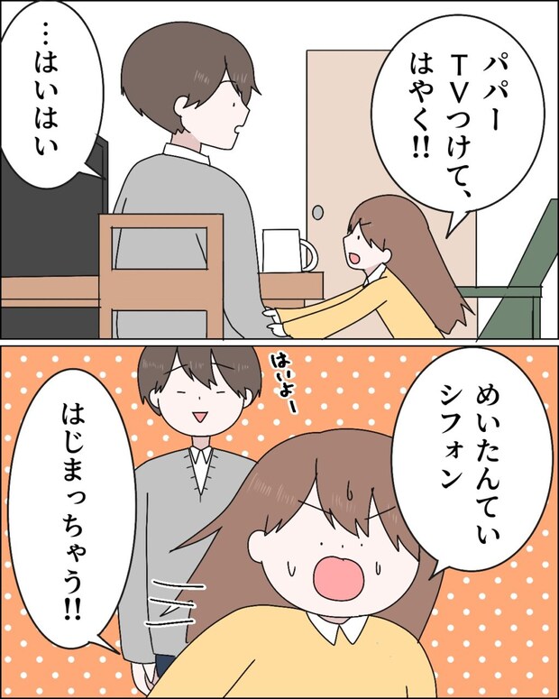 2人で難しい顔をしていると、マナが「パパーテレビつけて、はやく!めいたんていシフォンはじまっちゃう!」と駆け寄ってきました。どうやら、マナのハマっている『名探偵シフォン』が始まる時間のようです。康太は「・・・はいはい」と返事をすると、すぐにテレビをつけました。