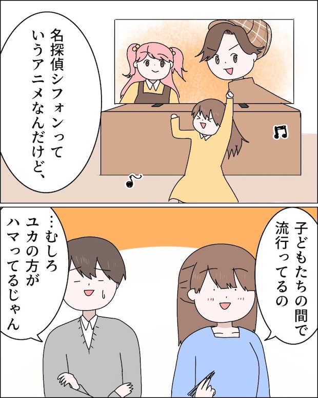 オープニング曲に合わせてノリノリで踊るマナ。「名探偵シフォンっていうアニメなんだけど、子どもたちの間で流行ってるの」と康太に説明しました。でも、私があまりに夢中でテレビを見つめているのを見て、康太は呆れたように「・・・むしろユカの方がハマってるじゃん」と突っ込みました。