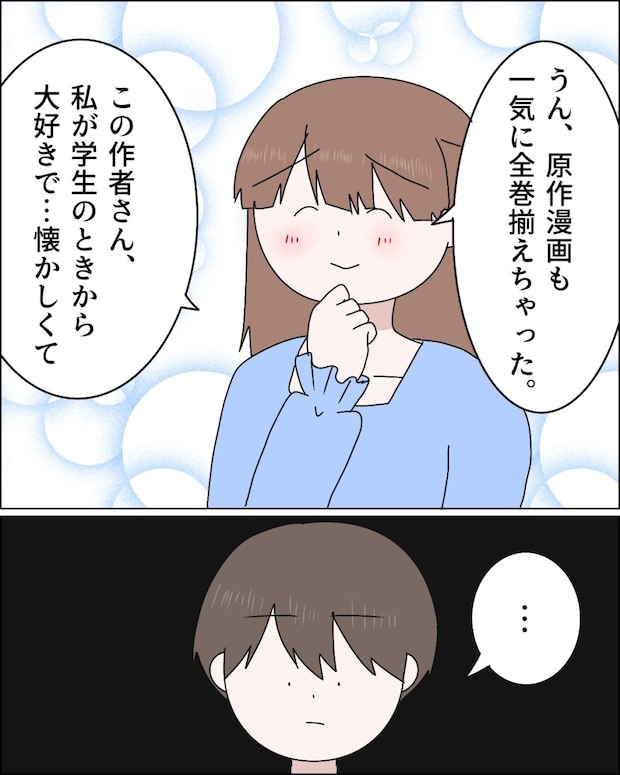 「うん、原作漫画も一気に全巻揃えちゃった、この作者さん、私が学生のときから大好きで・・・懐かしくて」嬉しそうにそう話す私を前に、康太は何か思うことがあるのか、考え込んだ表情のまま黙り込んでしまいました。