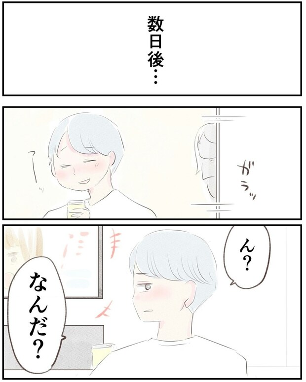 夫に「離婚」の話をしようとするものの、緊張からか震えているゆうさん。一方の夫は、ゆうさんのいつもと違う雰囲気に気づかずのんきにお酒を飲んでいます。