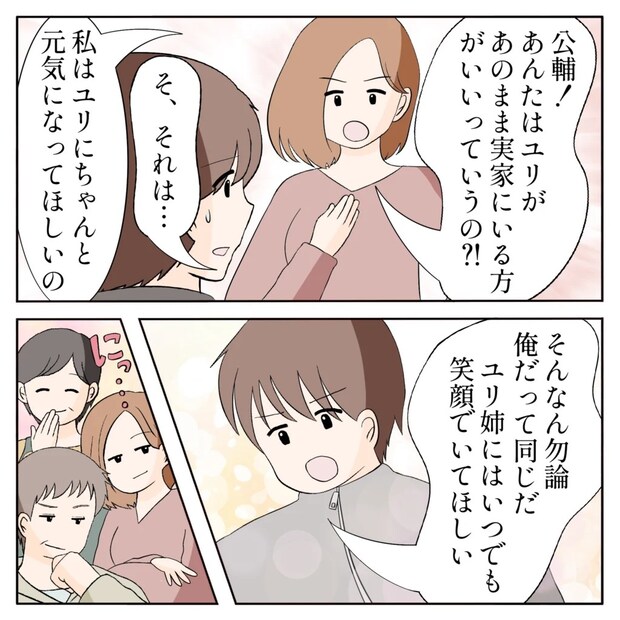 そして、「公輔!あんたはユリがあのまま実家にいる方がいいっていうの!?」姉ちゃんに詰められて、「そ、それは・・」と動揺する俺に、「私はユリにちゃんと元気になってほしいの」と言う姉ちゃん。「そんなん勿論俺だって同じだ。ユリ姉にはいつでも笑顔でいてほしい」そうハッキリする俺を見て、にやりと笑う家族たち。