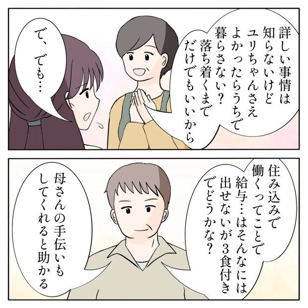 「詳しい事情は知らないけど、ユリちゃんさえ良かったらうちで暮らさない?落ち着くまでだけでもいいから」母さんの言葉に「で、でも・・」と躊躇するユリ。すると、「住み込みで働くってことで。給与・・はそんなには出せないが、3食付きでどうかな?母さんの手伝いもしてくれると助かる」と父さんが笑顔で言いました。