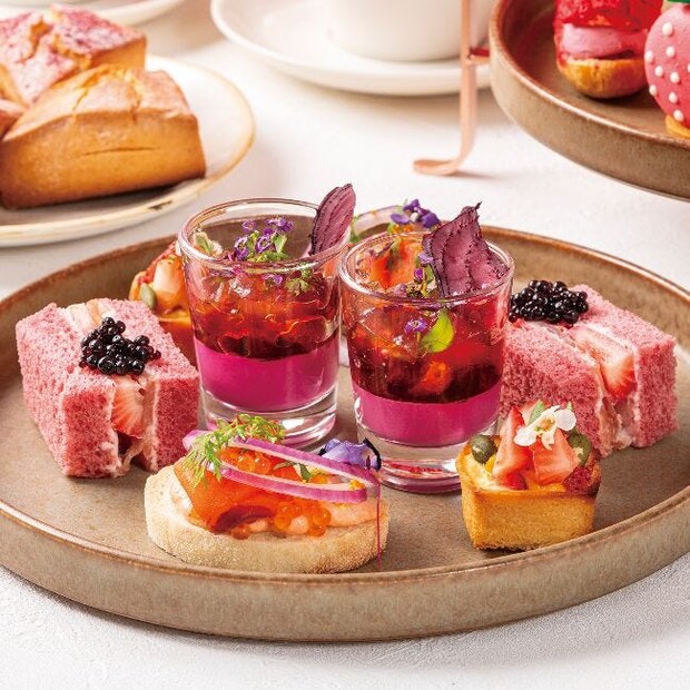 3段目には、「苺と生ハム クリームチーズのミニサンド」や、彩り鮮やかな「苺とスモークサーモンのタルティーヌ」など、いちごの甘酸っぱさを活かした個性豊かなセイボリーが4種類が用意される。