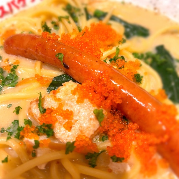 息子は新メニューのスープスパゲッティーより「鮭ハラスとほうれん草のクリームソース(小・1380円)にロングウインナー(180円)トッピング」