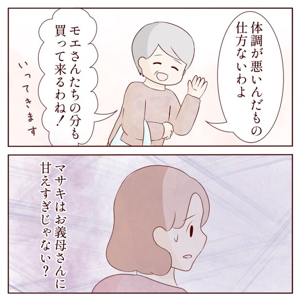 「体調が悪いんだもの。仕方ないわよ。モエさんたちの分も買って来るわね!」そう言って出かけて行く義母を見ながら、「マサキはお義母さんに甘えすぎじゃない?」と不安な気持ちに。