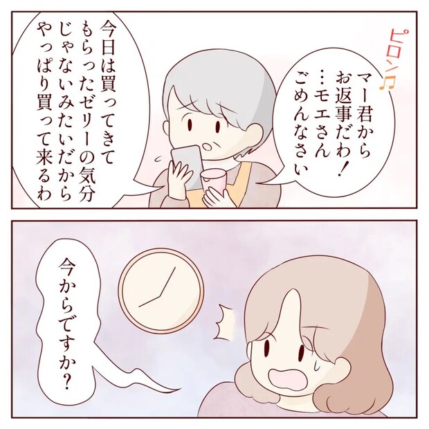 すると、ピロン「マー君からお返事だわ!・・モエさんごめんなさい。今日は買ってきてもらったゼリーの気分じゃないみたいだから、やっぱり買って来るわ」と義母が言ったのは夜の8時過ぎ!「今からですか?」と驚いてたずねると、