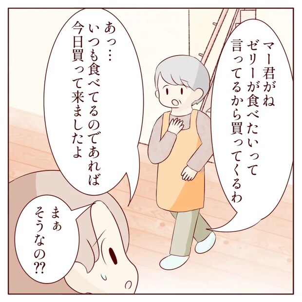 そして、「マー君がね、ゼリーが食べたいって言ってるから買ってくるわ」義母の言葉に、「あっ・・いつも食べてるのであれば今日買って来ましたよ」私がそう言うと、「まぁそうなの??」と義母が言い、マサキに確認しました。