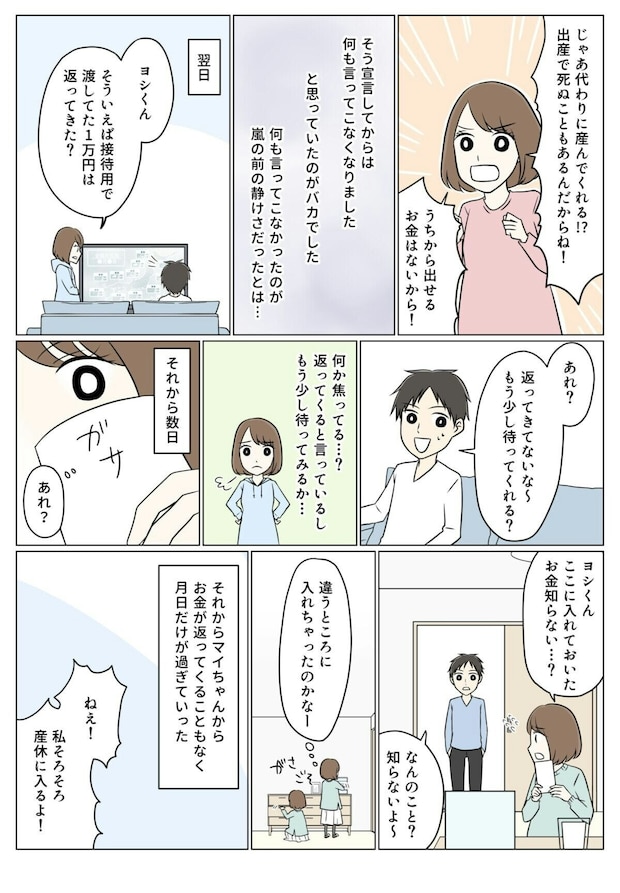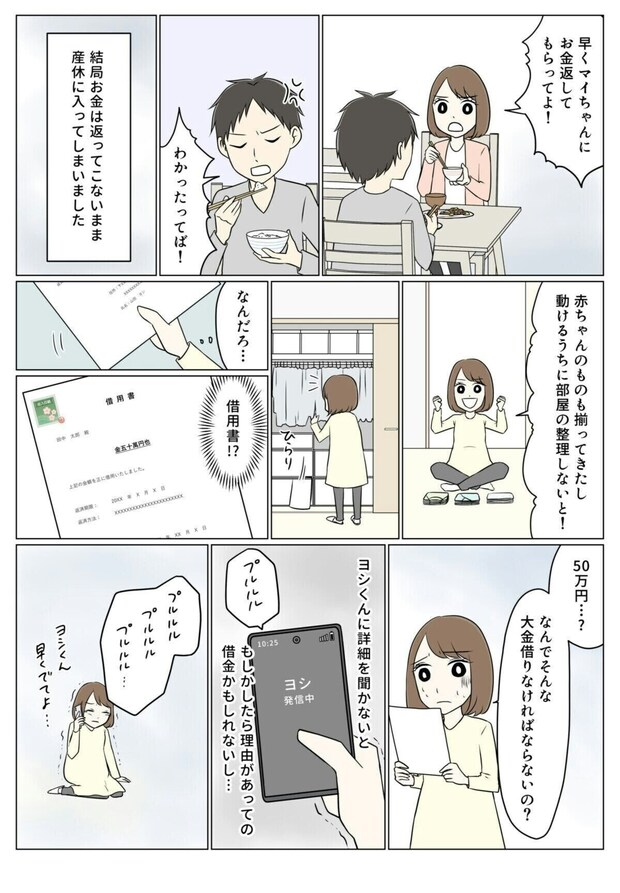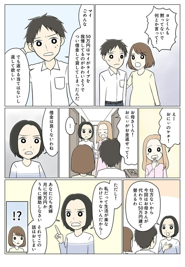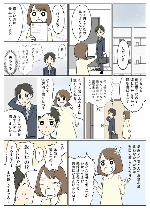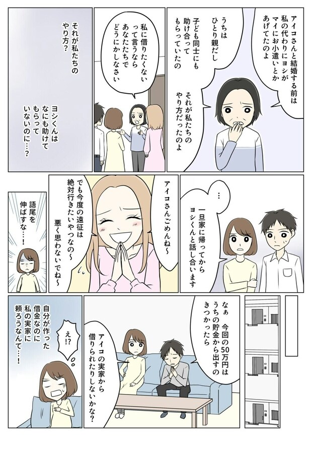 部屋の整理をしていると、夫名義の50万円の借用書を見つけ、驚きます。夫に問いただすと、「マイに渡すため」だと白状します。まさか借金までして、マイにお金を渡していたなんて…。マイから返してもらったお金で借金を返すつもりだと聞き、アイコは夫とともに義実家へと向かいます。