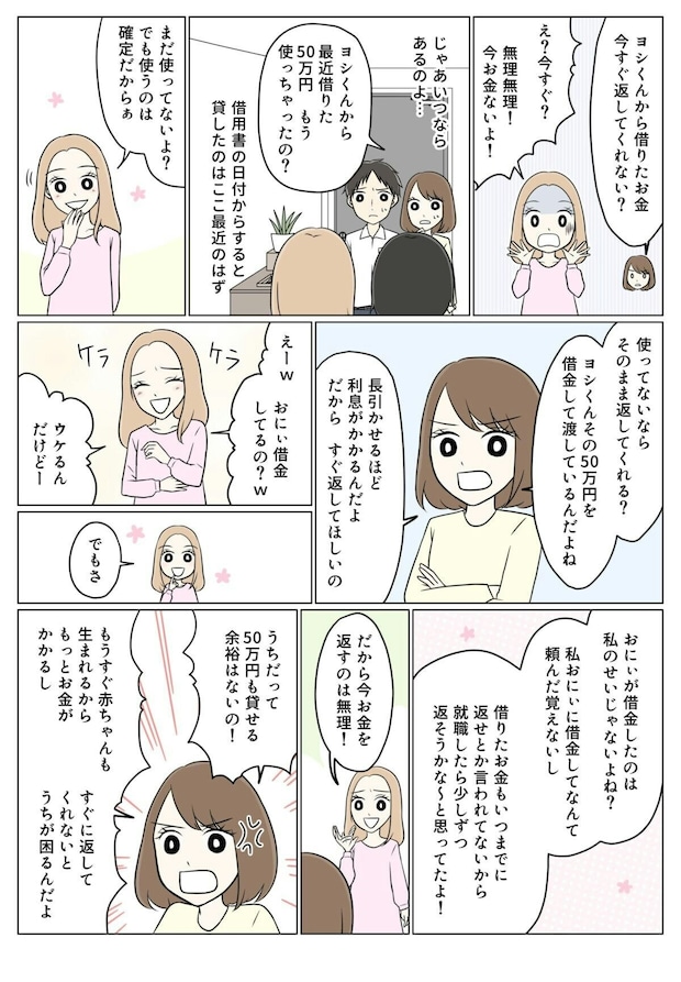 これまで何度もお金を貸したのに、全く返してこなかったマイ。50万円という大金を返せるとは到底思えないですよね。それなのに夫は自分名義で借金をし、利息を肩代わりするなんて…いくら家族といえど、やりすぎな気がします。
