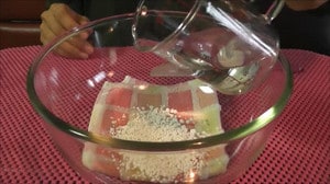一度電子レンジで加熱したら、再度混ぜます。