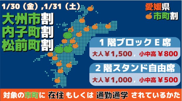 大洲市・内子町・松前町に在住・通勤・通学されている方は、2階スタンド自由席が大人1,000円、小中高500円に!31日は大洲銘菓「志ぐれ」のプレゼントもあります。