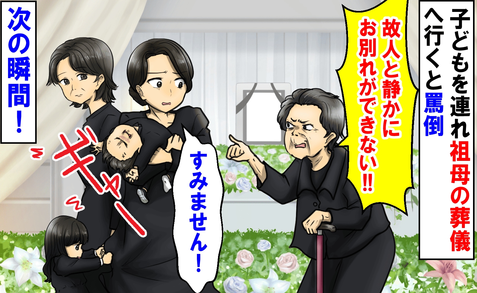 「故人と静かにお別れができない!」子どもを連れ祖母の葬儀へ行くと罵倒→次の瞬間、親族の1人が…!