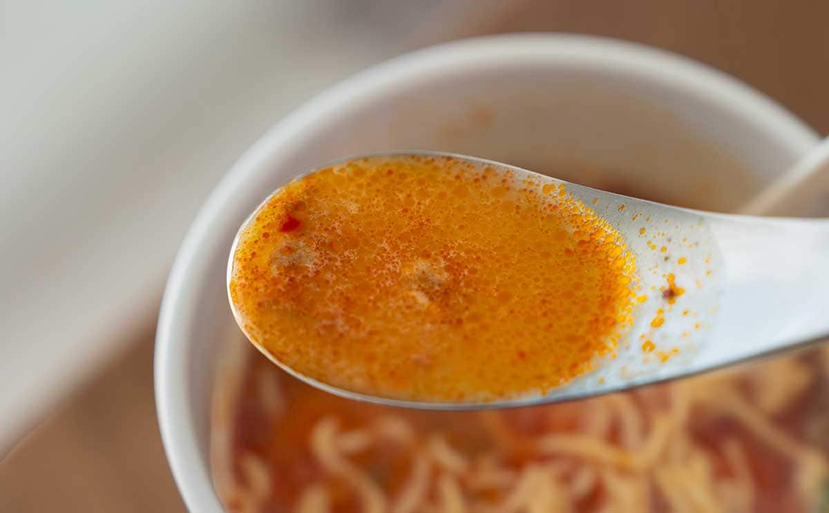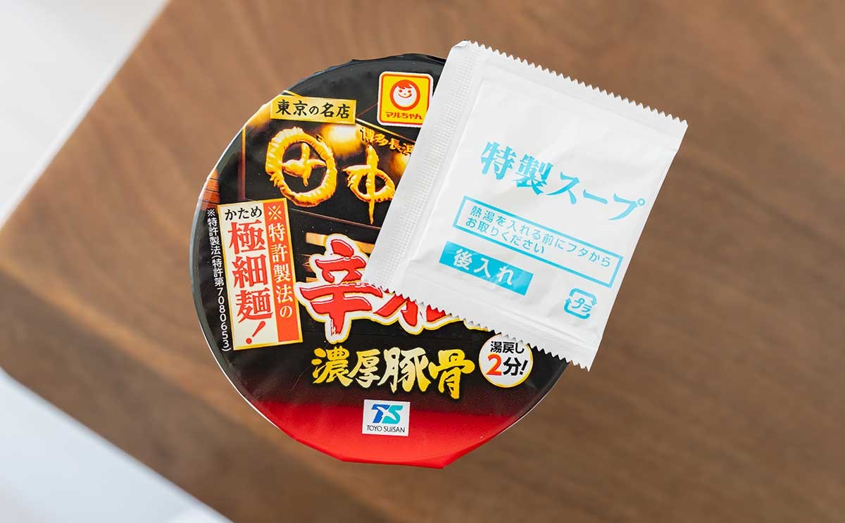 「田中商店 辛オニ濃厚豚骨」には、「特製スープ」が付いています。熱湯をカップの中に注いで“2分”待ち、仕上げに特製スープを加えて、よくかきまぜたら完成です。