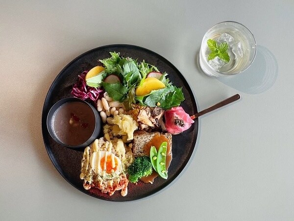 12:00に「くすきの杜 カフェレストラン」で昼食をとる。メニューは、地元食材を使用した季節の野菜たっぷりのWellnessプレート。そして13:30から健康茶づくり体験(お土産付き)、