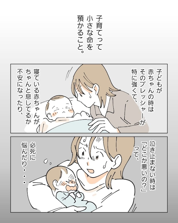 「子育てって小さな命を預かること。子どもが赤ちゃんの時はそのプレッシャーが特に強くて、寝ている赤ちゃんがちゃんと息してるか不安になったり、泣き止まない時は『どこか悪いの?』って必死に悩んだり・・」