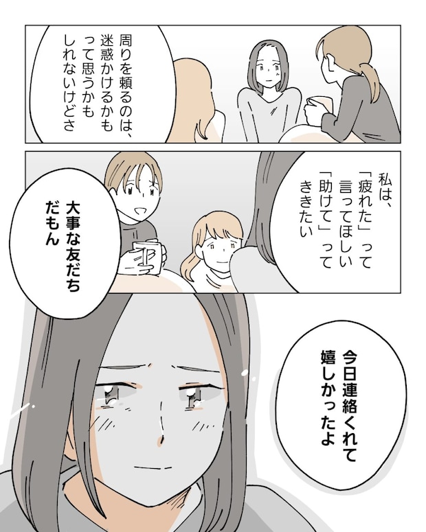 自身が限界だと感じた子育ての辛さを話した後、「愚痴ばっかりでごめん」と謝るナオさんに、サツキさんが優しく「水くさいなぁ」と一言。「母親だって人間」「つらいって言っていい」「『疲れた』って『助けて』って聞きたい。大事な友だちだもん」こんな風に思ってくれる友だちがいることを、まずは幸せだと思いたいですよね。