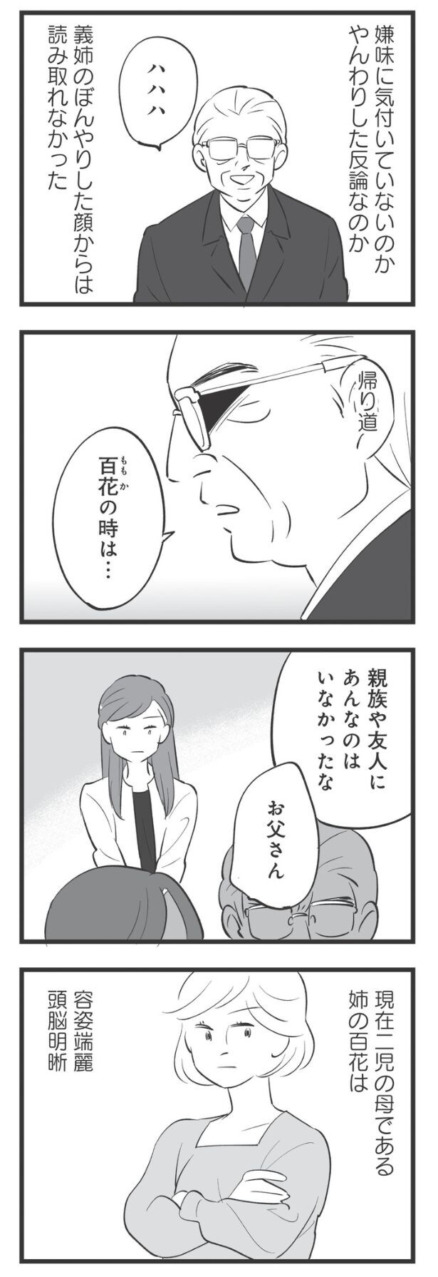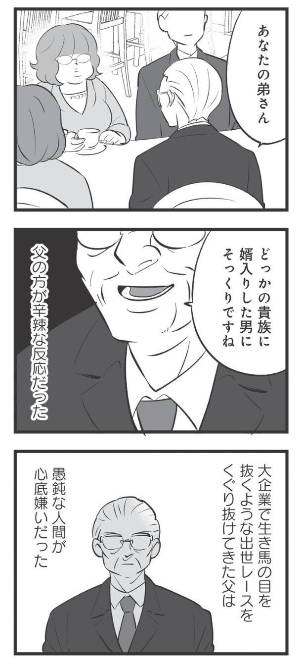 前回、夫の家族について「問題があるのは母親だけ」と聞かされていたのに、実際には母親だけではなく姉や父親にも問題があると感じた弟嫁。愚鈍な人間が大嫌いな弟嫁の父親は、顔合わせで辛辣な反応を見せていた。