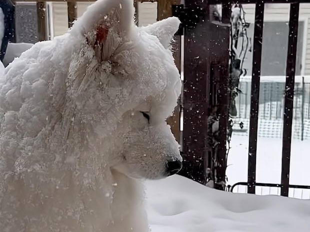 白い毛の体に、少しずつ雪がくっついていきます。