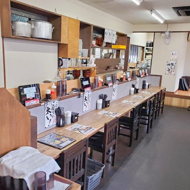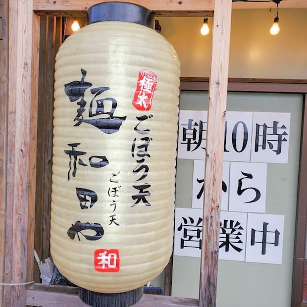 通り沿いにどんと構える「極太ごぼう天うどん」の大きな看板が目印で、初めてでも迷わずたどり着けます。