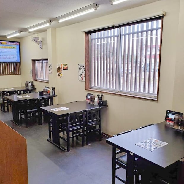 店内は清潔感ある白を基調とした壁面に、ダークブラウンのテーブルと椅子が配置され、シンプルながらも落ち着いた空間が広がっています。