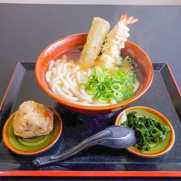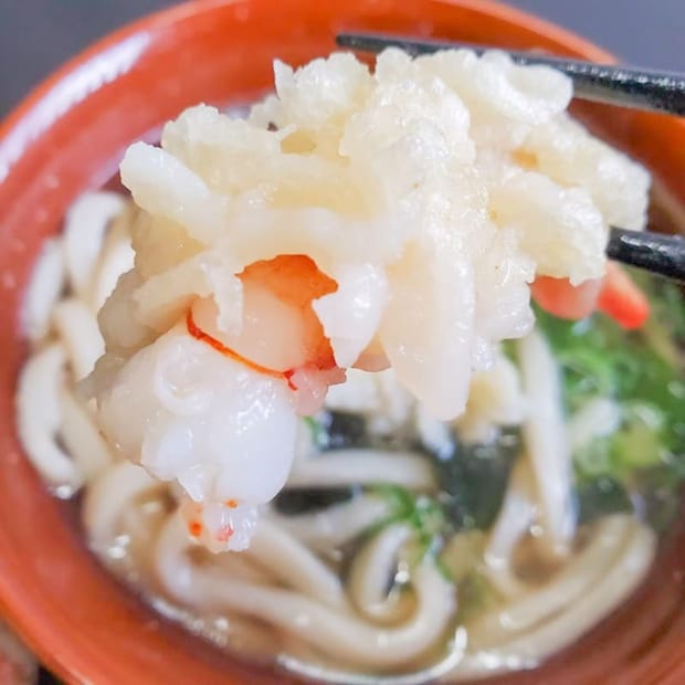 海老ごぼう天うどん 800円・かしわおにぎり 150円/1個