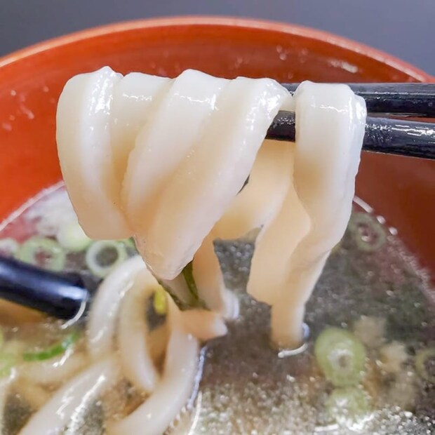 一方、やや太めのうどん麺は箸で持ち上げた瞬間に伝わる重量感ともちもちとした弾力が最大の特徴。