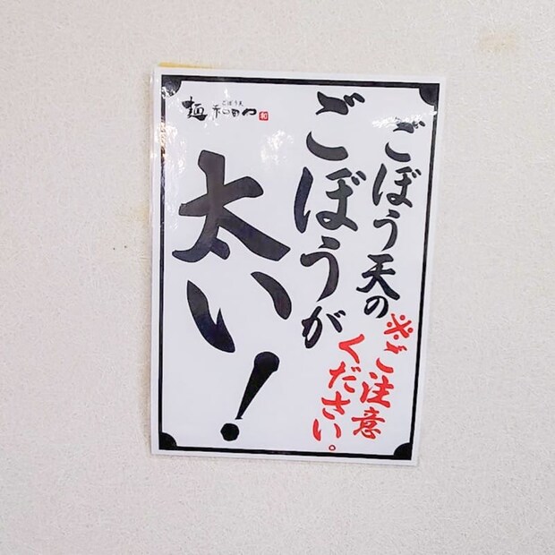さぁ!どれからいただこうかと考えつつふと壁に目をやると、「ごぼうの太さ」を注意喚起するユニークな張り紙が。