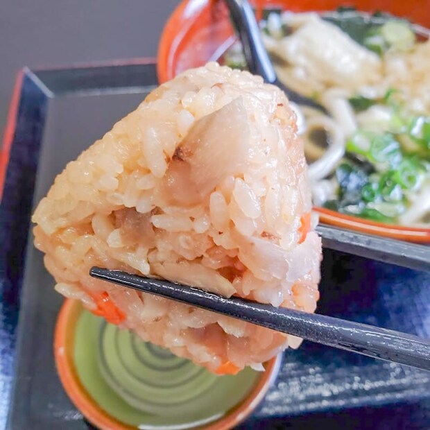 やや甘めの味付けがどこか懐かしく、鶏肉や人参などの具材がゴロゴロと贅沢に入った「かしわおにぎり」も、すっきりとした出汁との相性が抜群。