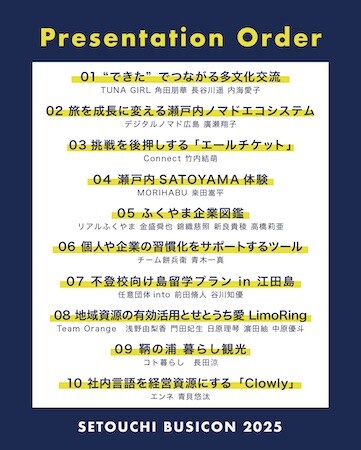ファイナリスト10チームは次の通りだ。大学生チームは全7組。角田朋華さん、長谷川遥さん、内海愛子さんからなる「TUNA GIRL」は、“できた”でつながる多文化交流を発表。竹内結萌さんの「Connect」は、挑戦を後押しする「エールチケット」を発表する。金盛舜也さん、錦織慈照さん、新良貴稜さん、高橋莉亜さんからなる「リアルふくやま」が発表するのは「ふくやま企業図鑑」。青木一真さんの「チーム餅兵衛」は、個人や企業の習慣化をサポートするツールを発表。前田脩人さん、谷川知優さんによる「任意団体 into」は、「不登校向け島留学プラン in 江田島」を発表する。浅野由梨香さん、門田妃生さん、日原理琴さん、濵田紬さん、中原優斗さんによる「Team Orange」は、地域資源の有効活用とせとうち愛 Limo Ringを発表。チーム「エンネ」は、青貝悠汰さんが社内言語を経営資源にする「Clowly」を発表する。