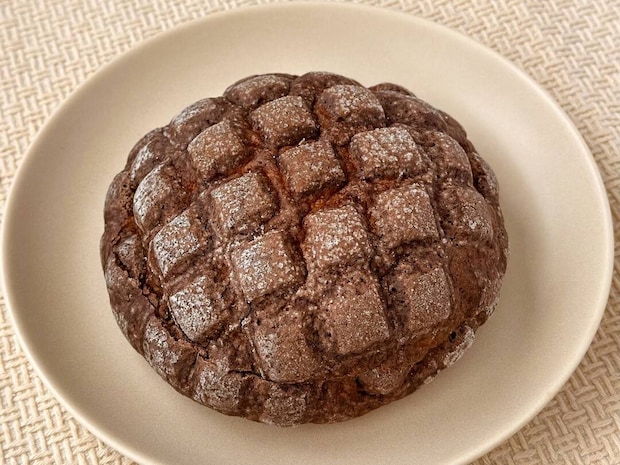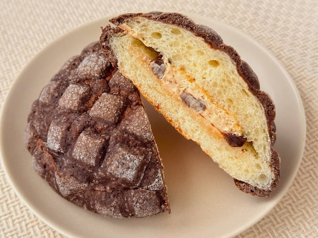チョコレートカラーがかわいらしい見た目の「ヘーゼルナッツのショコラメロンパン」。表面はココア入りヘーゼルナッツ風味ビスケット生地が重なっており、パンの間にはヘーゼルナッツホイップとヘーゼルナッツチョコクリームもサンドされています。