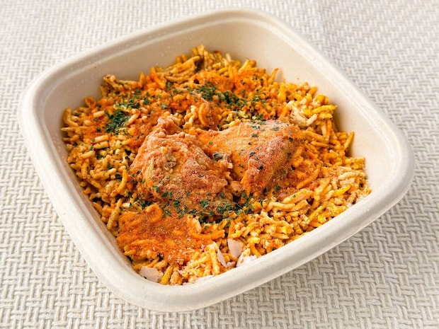 インドのビリヤニを参考に作られた「チキンビリヤニ」。バスマティライスは、10種類以上のスパイスやトマトなどをベースに味付けされています。