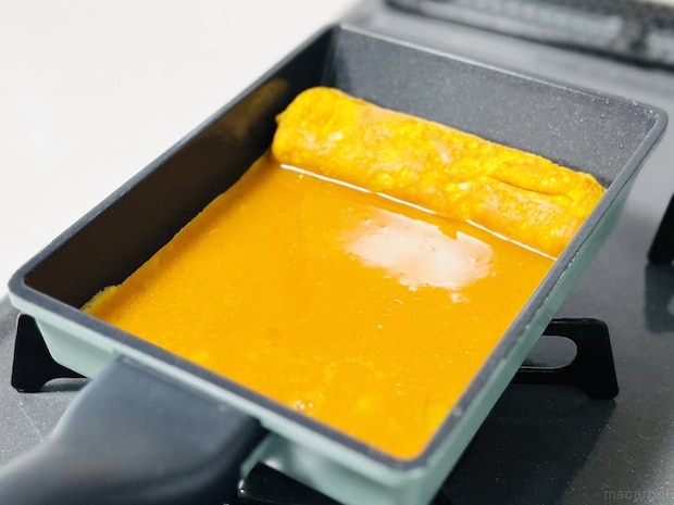 卵液に油を入れているので、焼くときの油は気持ち少なめでも大丈夫ですよ。