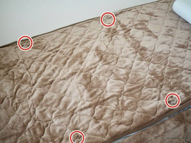 ちなみに筆者は敷パットがめくれやすい中央部分に2つ、足元側に2つ取り付けてみましたよ。冬用の厚みのある敷パットを使用しているので、外れにくさが気になっていましたが、想像以上にしっかり固定されて驚き!