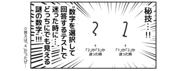 2026年1月27日 テストで迷ったときは、「どっちにも見える謎の数字」を書いて乗り切る!テストの秘技に「やったことある」の声続出/コハラモトシさん傑作選 Walkerplus 完璧主義に苦しんだり、人目を気にしたり、人から言われた一言に落ち込んだり…。そんな誰もが抱える悩みの対処法を描く、漫画家のコハラモトシさん。数々の人気作品の中から、読めば前向きになれるストーリーを集めた傑作選をお届けします。 →『コハラモトシさん傑作選』を最初から読む 賢いのかバカなのか分からない戦法(1) / 画像提供:コハラモトシ(@kohara_motoshi)賢いのかバカなのか分からない戦法(2) / 画像提供:コハラモトシ(@kohara_motoshi)賢いのかバカなのか分からない戦法(3) / 画像提供:コハラモトシ(@kohara_motoshi) →【漫画】この漫画をはじめから読む →【漫画】『怖いトモダチ』を読む →【漫画】『恐らく誰の人生にも影響を及ぼすことはない僕のサラリーマン生活』を読む 著:コハラモトシ