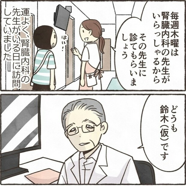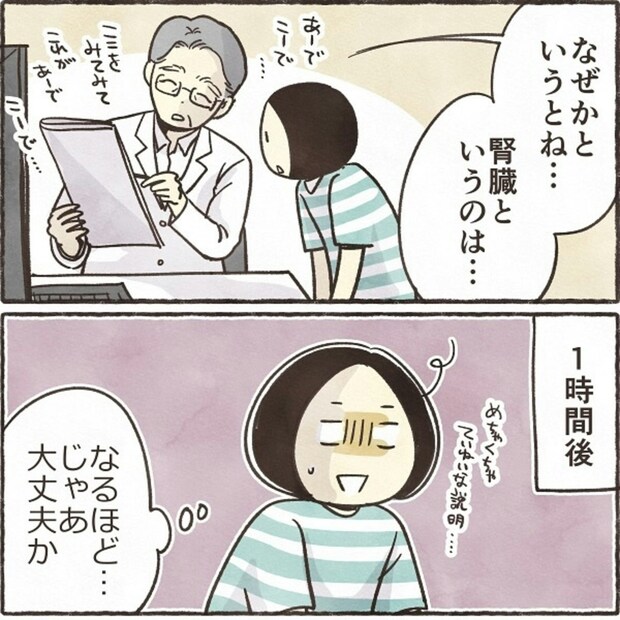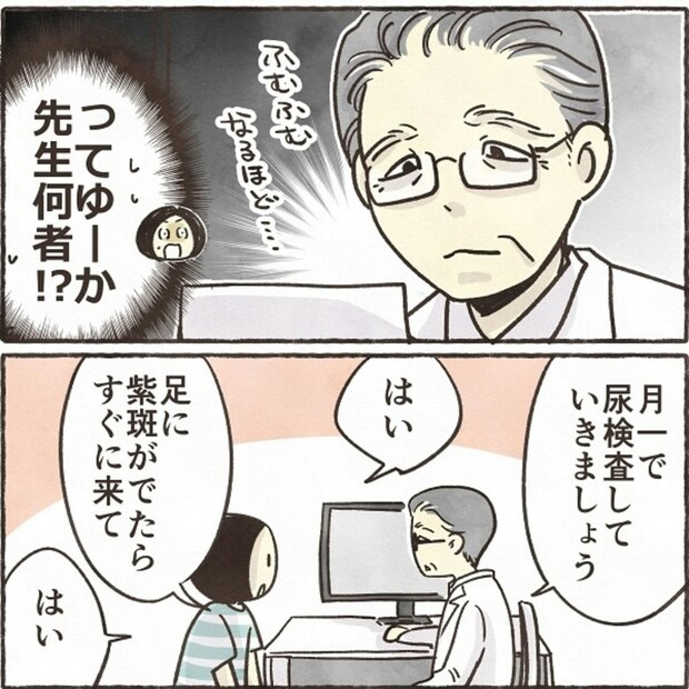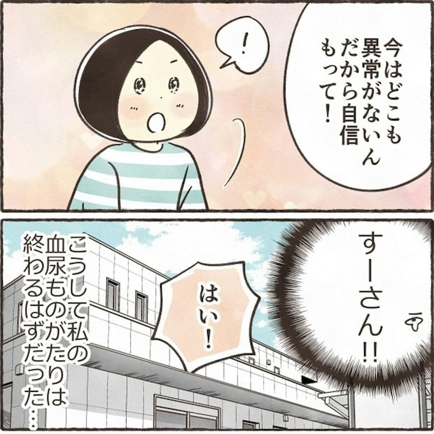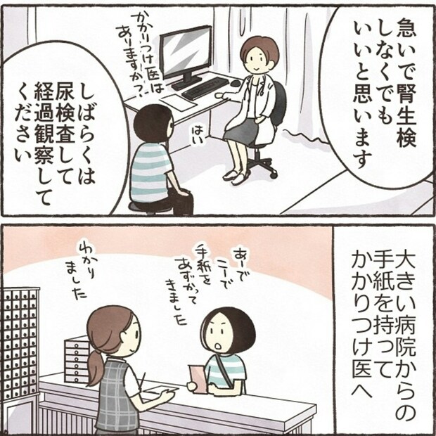 1週間の努力が実り、尿検査で異常は見つからず心からホッとしたきなこさん。急いで腎生検をする必要もなく、しばらくは尿検査で経過観察することになり、腎臓内科の先生の元へ向かいます。