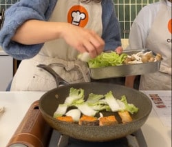3. フライパンに油(またはオリーブオイル)を熱し、鮭を皮目から中火で焼きます。焼き色がついたら裏返して端に寄せ、空いたスペースで白菜としめじをサッと炒めます。