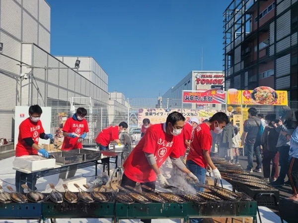 今年のサンマ漁は数年ぶりの豊漁で盛り上がりを見せているという。「山安さんま祭り」は、合計6,000尾の炭⽕焼きサンマを募⾦してくれた人々に振る舞う⼈気のチャリティーイベントだ。毎年、小田原市のふるさと緑基金に寄付を行うため、100円以上の募金の協力をお願いしている。