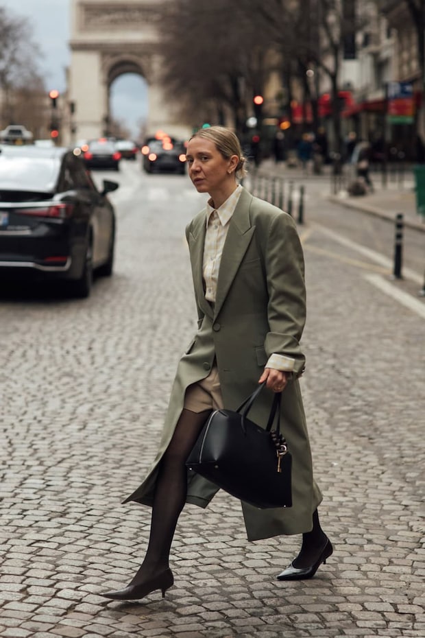かっちりとしたチェスターフィールドコートとショートパンツの組み合わせが新鮮! このスタイリングの一番のポイントは、なにげにタイツだと思います。これに厚手だと野暮ったく見えますが、彼女が選んだのはイイ感じに透ける薄手。それによって抜け感が生まれ、コートとショートパンツの大胆な合わせをより引き立てることに成功しています。寒さが和らいだら、チャレンジしたいかも!