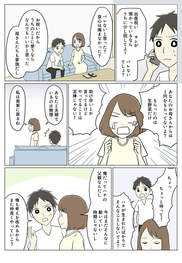 借金だけでは済まず、生まれてきた子どもに対していただいた出産祝い金にまで手をつけたヨシ。しかも、それを提案してきたのが義母というから驚きです。