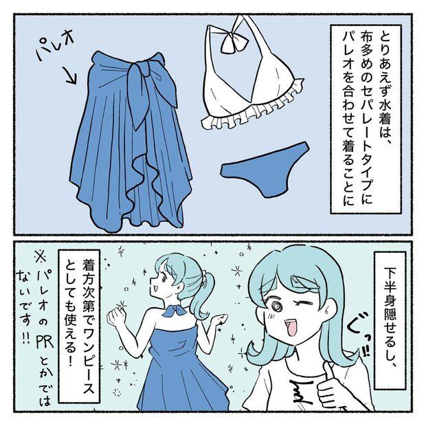 りったさんがナイトプールに選んだ水着は、布多めのセパレートタイプにパレオ。目標にしていたビキニではありませんが、これからも健康のためにダイエットをゆるく続けていきたいと思うようになりました。
