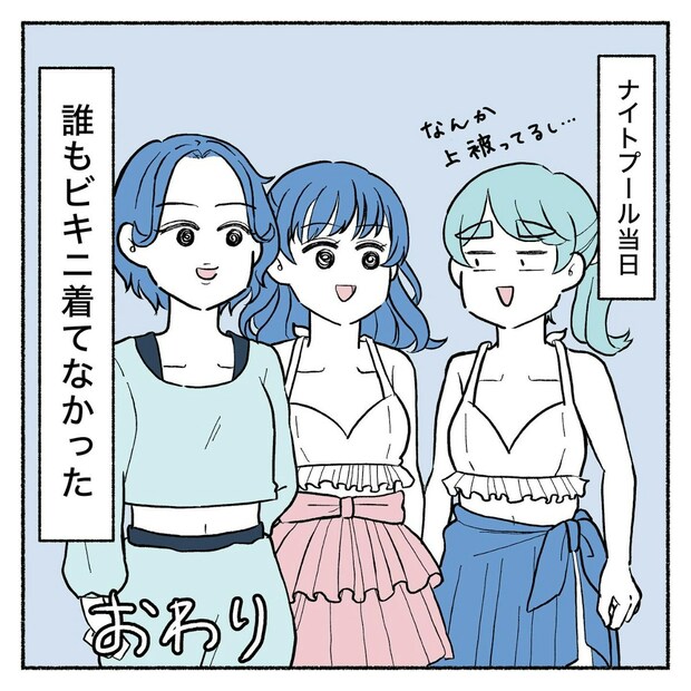 人生初のダイエットに挑戦したりったさん。1か月半後の体重は、2キロマイナスの大成功でした。おなかが出たままなのは少し気になるところでしたが、健康のためにも満足な結果が得られました。そしてナイトプールの日、目標だったはずのビキニを着ている人は誰もいませんでした…。