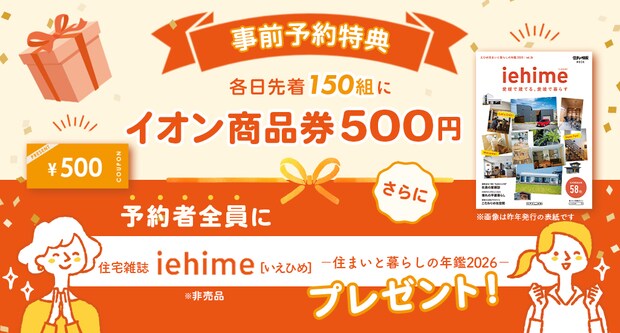 各日先着150組に来場予約&アンケート回答でイオン商品券500円分と、住宅雑誌「iehime─住まいと暮らしの年鑑2026─」(非売品)をプレゼント♪