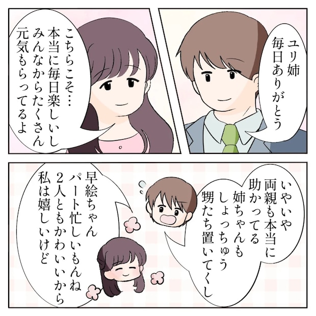 「ユリ姉、毎日ありがとう」俺はユリ姉に改めてお礼を伝えます。するとユリ姉は「こちらこそ、本当に毎日楽しいし、みんなからたくさん元気もらってるよ」と優しい言葉を返してくれました。「いやいや両親も本当に助かってる、姉ちゃんもしょっちゅう甥たち置いていくし・・・」俺がそう言うと、ユリ姉は「早絵ちゃんパート忙しいもんね、2人ともかわいいから私は嬉しいけど」と仏のような言葉をかけてくれます。