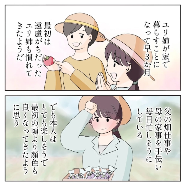 それから早3ヶ月。最初は遠慮がちだったユリ姉も徐々に慣れてきたようで、最近はぎこちなさが少なくなった気がします。父の畑仕事や母の家事を手伝って毎日忙しそうですが、本人はとても楽しそう。最初の頃より顔色も良くなってきたように思えます。
